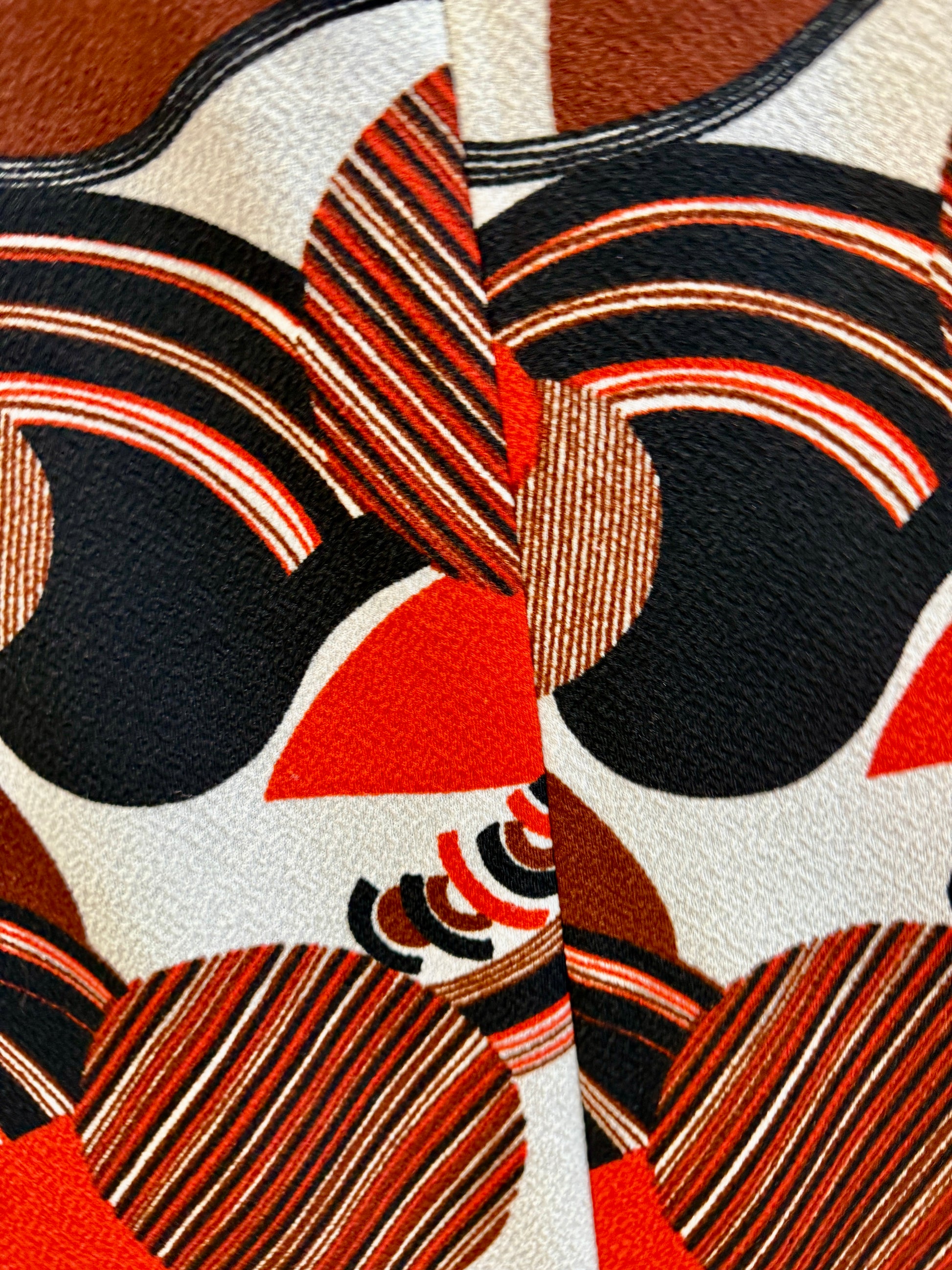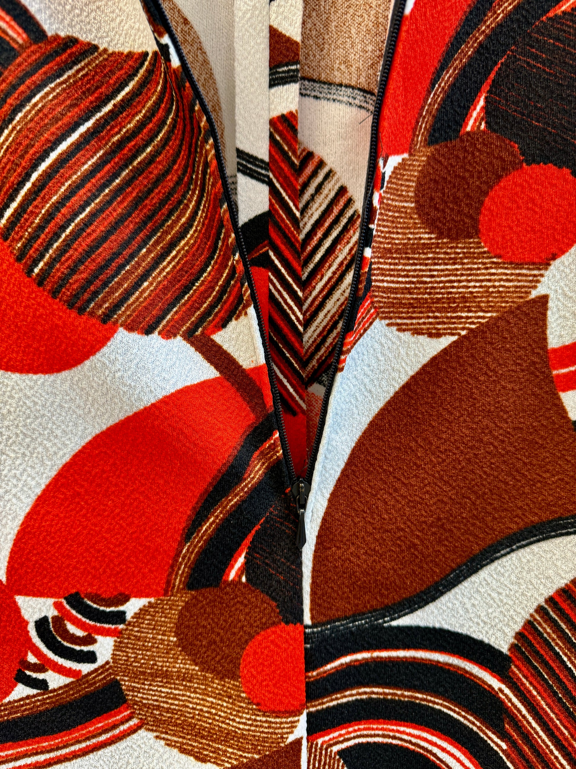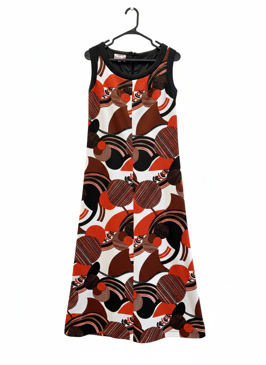 En fantastisk, färgsprakande a-linjeformad retropärla i härliga toner av orange, rött, brunt, svart och vitt. Jag hittade den i en second-hand butik i Helsingborg. Klänningen är från svenska Martinette, modell 38, och har ett vackert fall i stretchigt polyester-jerseytyg. Ärmlös modell med bekväm passform och ljuvligt skarpt grafiskt mönster som verkligen fångar blicken.